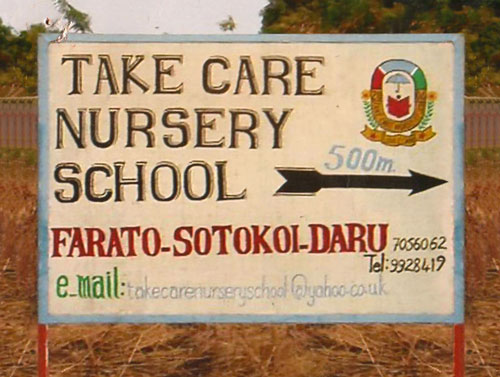Take Care Nursery School is located in a village called Farato-Sotokoi-Daru, in west Gambia. It was founded in 2004 by School headmaster, Bakary Kujabi.